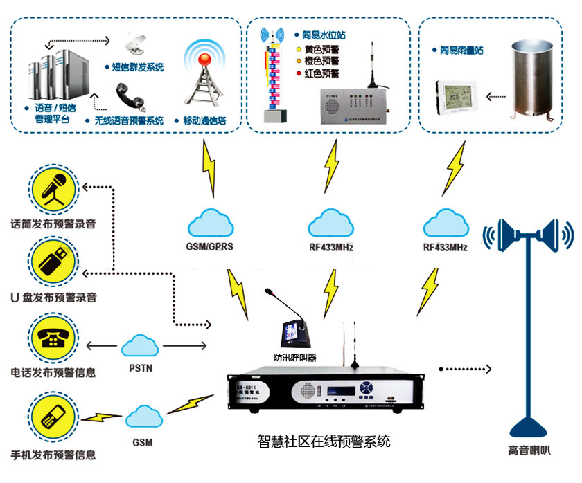 智慧社區(qū)在線預(yù)警系統(tǒng)由無線預(yù)警廣播、無線降雨告警器、水位報(bào)警器組成。
